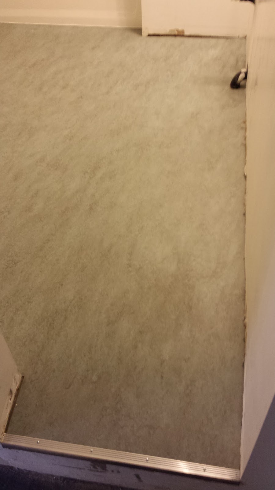 Here is another kitchen, bathroom and closet l did in marmoleum. Some of these photos show how l am able to install marmoleum around posts and make the hand scribed seams nearly invisible. The kitchen with the post has multiple seams in it. The bathroom has 1. Closet none. For this project l asked the client for 32 feet of marmoleum. Unfortunately for him he elected to purchase remnants that equalled 32 feet. Bad idea…unless you specifically want a different color. In t his case it’s cause he didn’t know that even though the marmoleum appears to be the same color…they are not. So….at this point in the project rather them get the correct amount of feet in the same color the client elected to have me install it. Came out great aside from the different colors. So if you are considering getting remnant pieces..make sure they are off of the same roll. Otherwise you to will run into the same problem.